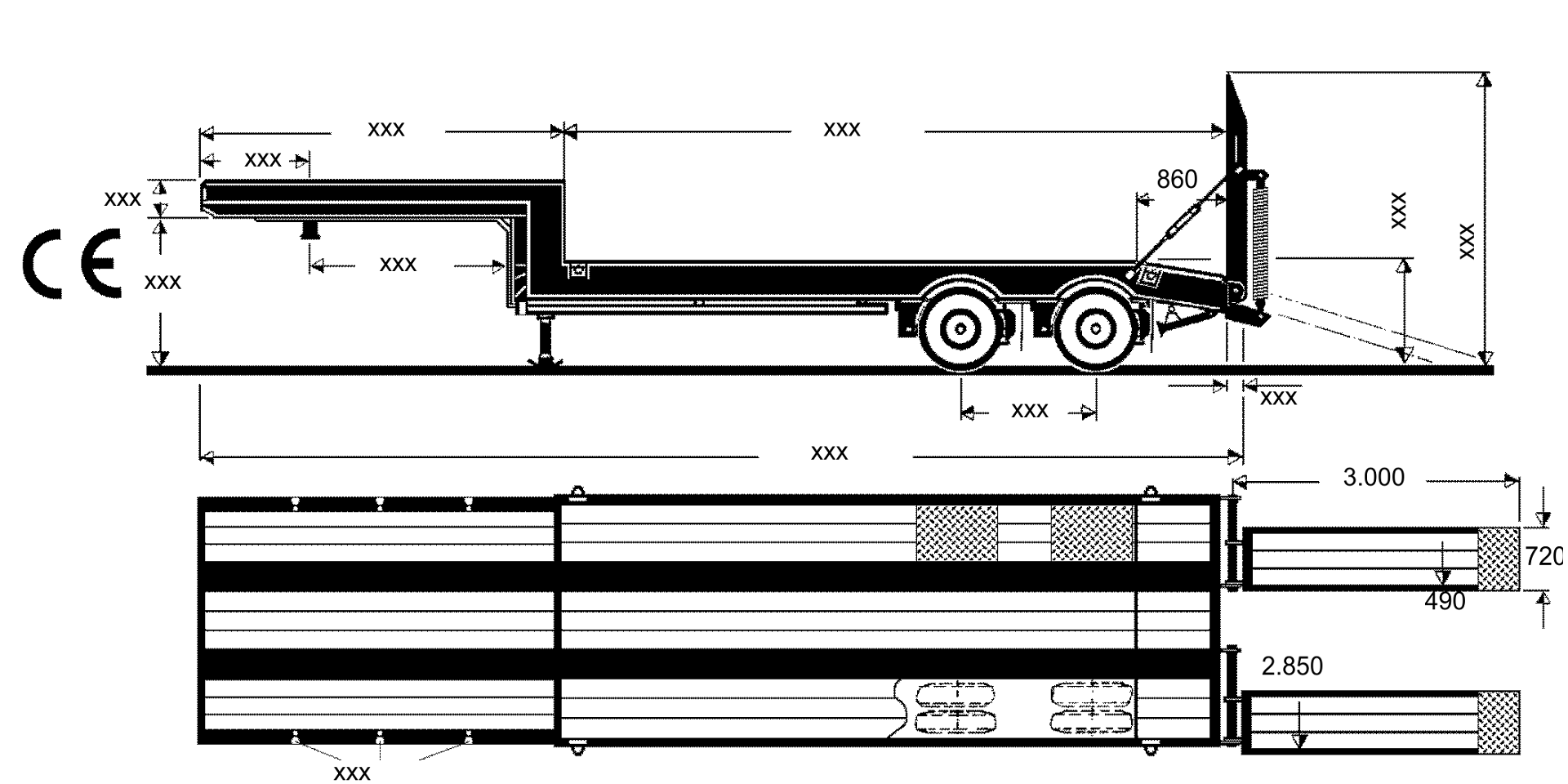 Rampen Einteilige Rampen feuerverzinkt (offene Bauweise) mit eingelegtem, längsverlaufendem Nadelholzbelag, 50mm stark. Rampenverschub von 2.850 außen auf 490mm innen. Rampenhaltegestänge mit Einhängemöglichkeit an der Rampe.
