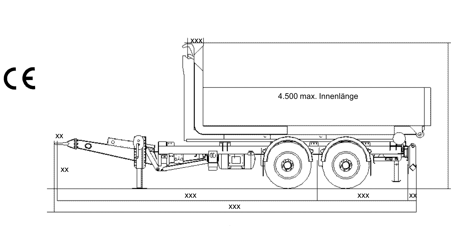 Hakenlift Behälterwechselsystem mit Schiebe-Hakenarm zum Transportieren, Aufziehen, Abrollen, Umladen und Kippen, austauschbarer Ladungsträger. Containerlänge bis 5.000mm in Verbindung mit klappbarem Unterfahrschutz möglich. Hakenhöhe 1.570mm nach DIN 30722, hydraulische Innenverriegelung hinten.