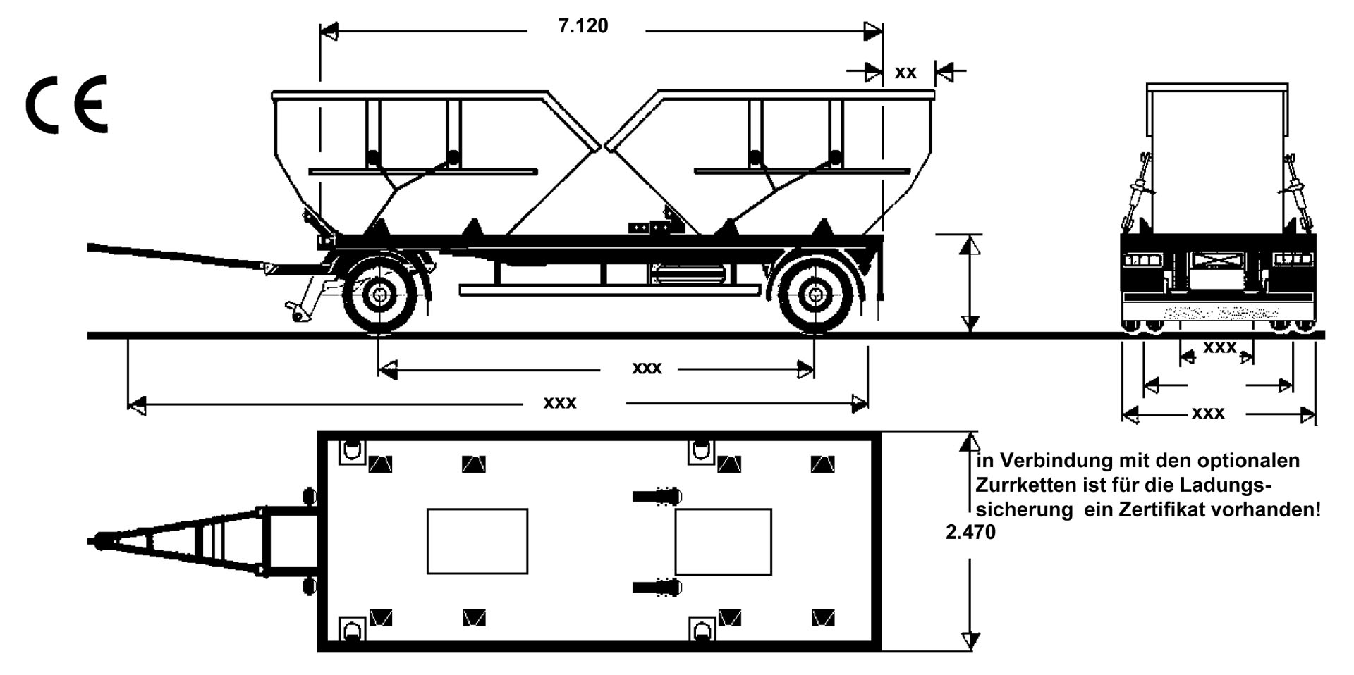 verstellbar für 2. Mulde. 4 UVV-Zurringe 5t zum Einhängen von Spannelementen, hiermit müssen die Mulden form und