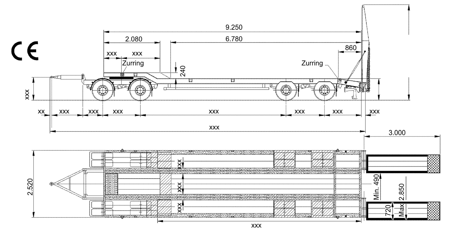 Rampen Einteilige Rampen feuerverzinkt (offene Bauweise) mit eingelegtem, längsverlaufendem Nadelholzbelag, 50 mm stark. Rampenverschub von 2.850 außen auf 490 mm innen. Rampenhaltegestänge mit Einhängemöglichkeit an der Rampe.